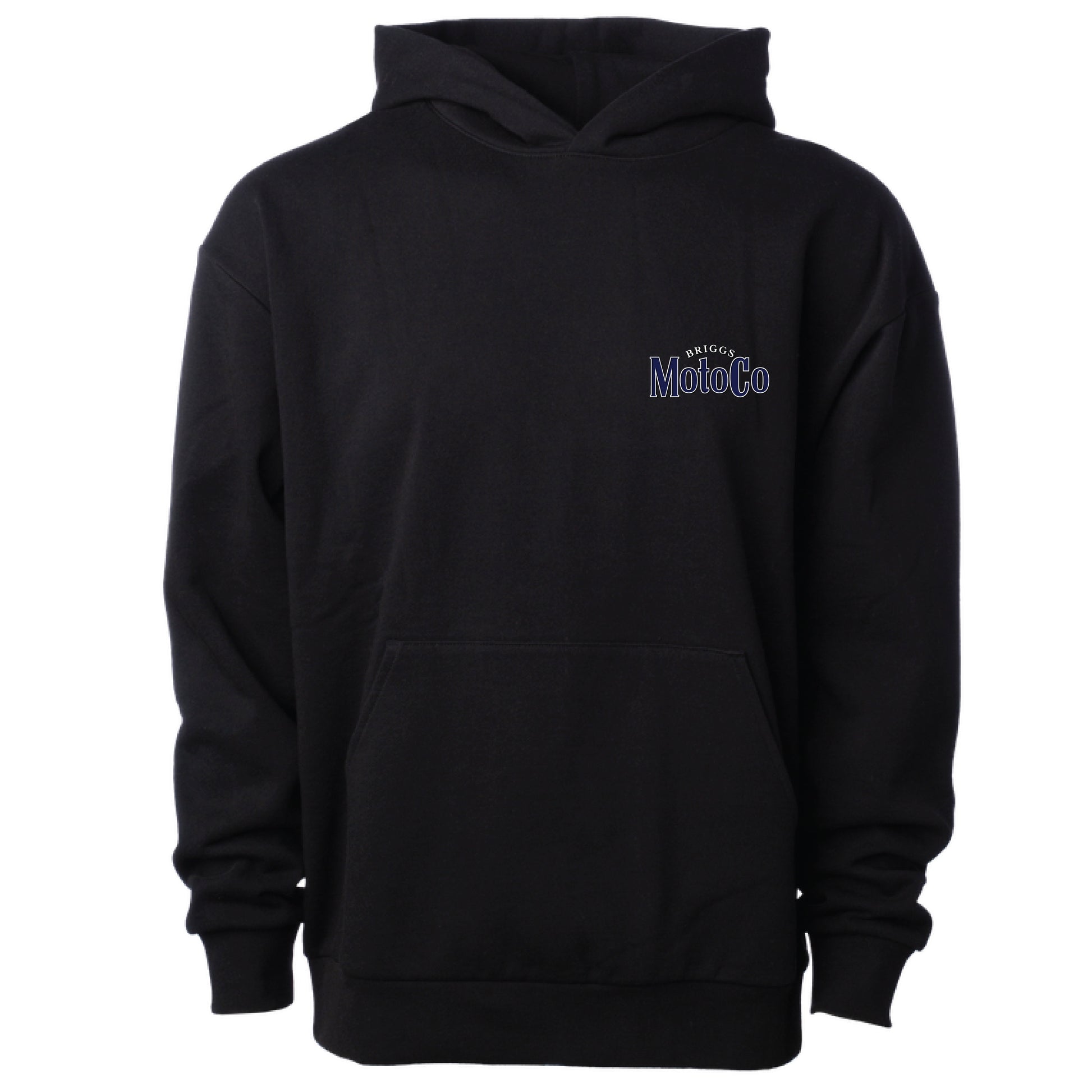This new motocross hoodie features a front side chest print of "Briggs MotoCo" in navy and white. The full rear print displays the classic Modelo style label, but in true Briggs style, complete with the "imported from" line and lions printed in blue, gold, grey, white.